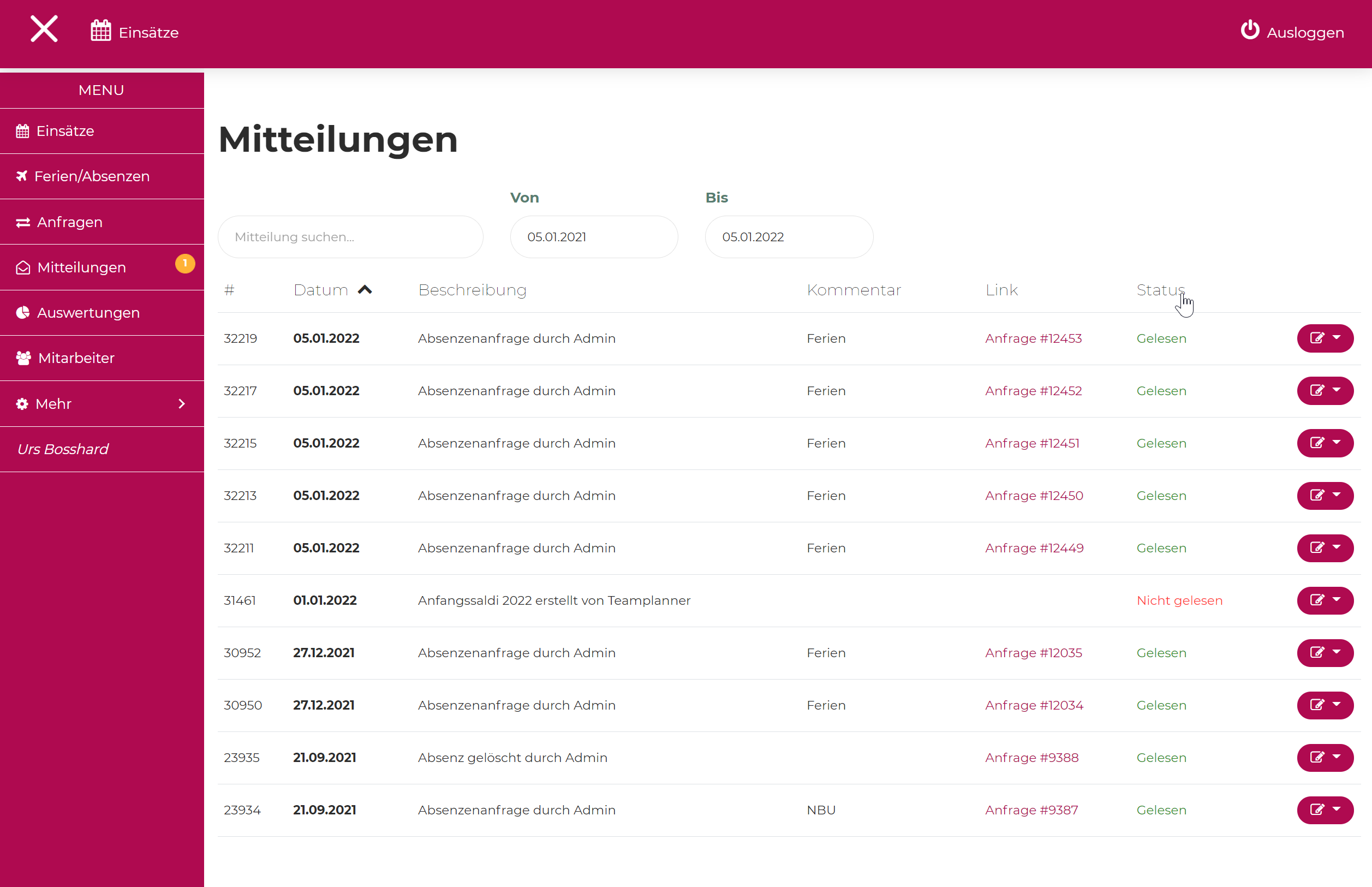 Si des demandes de vacances ou de compensation d'heures supplémentaires sont faites par des collaborateurs, l'administrateur reçoit un message qu'il peut accepter ou refuser et accompagner d'un commentaire. Ce n'est que lorsque les vacances sont acceptées qu'elles apparaissent dans le plan d'affectation. Il est également possible de trier toutes les notifications (par ex. par statut). Dès que l'admin accepte ou refuse une demande, le collaborateur reçoit un message (e-mail).