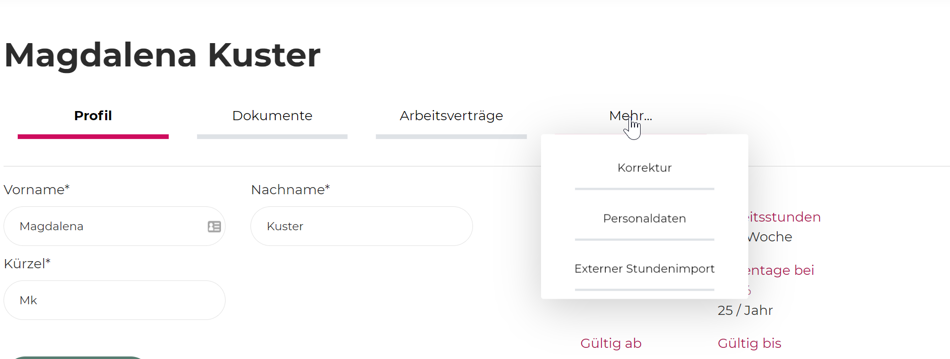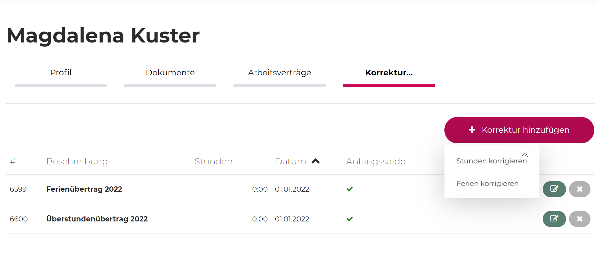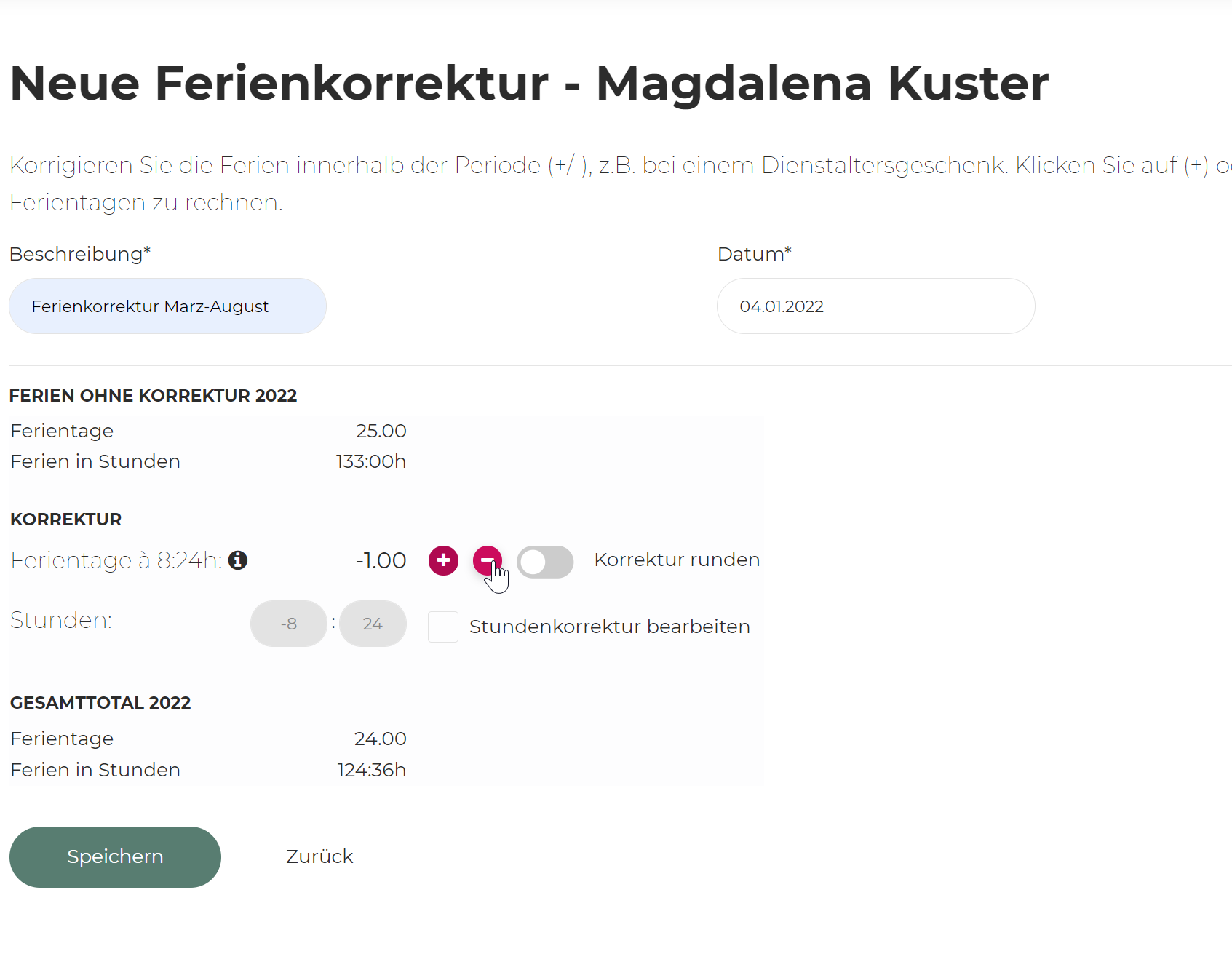 Lors de l'ajout de la correction, il faut toujours distinguer s'il s'agit d'une correction en heures (temps de travail) ou d'une correction de vacances. La correction de vacances peut également être en heures, mais pas en heures de travail.