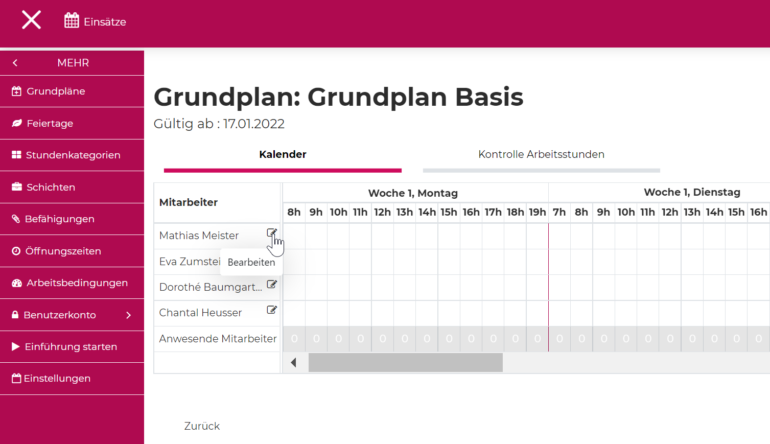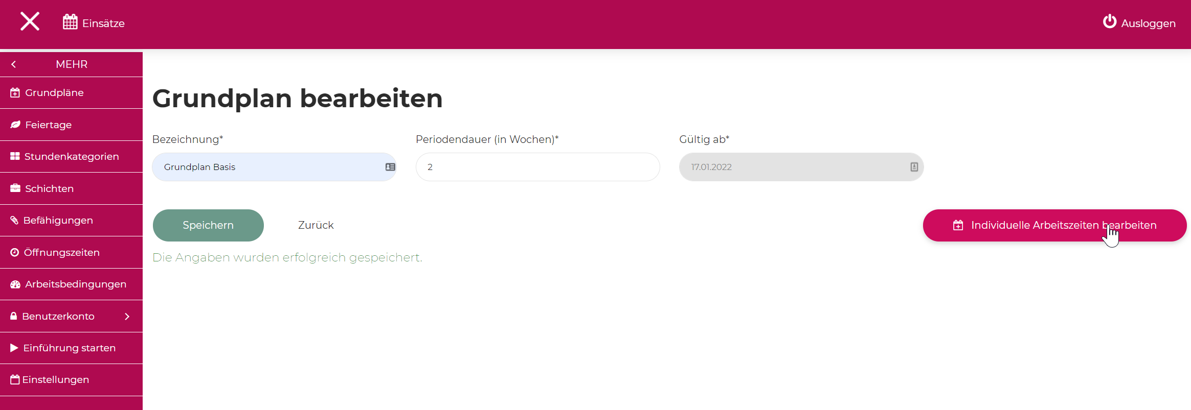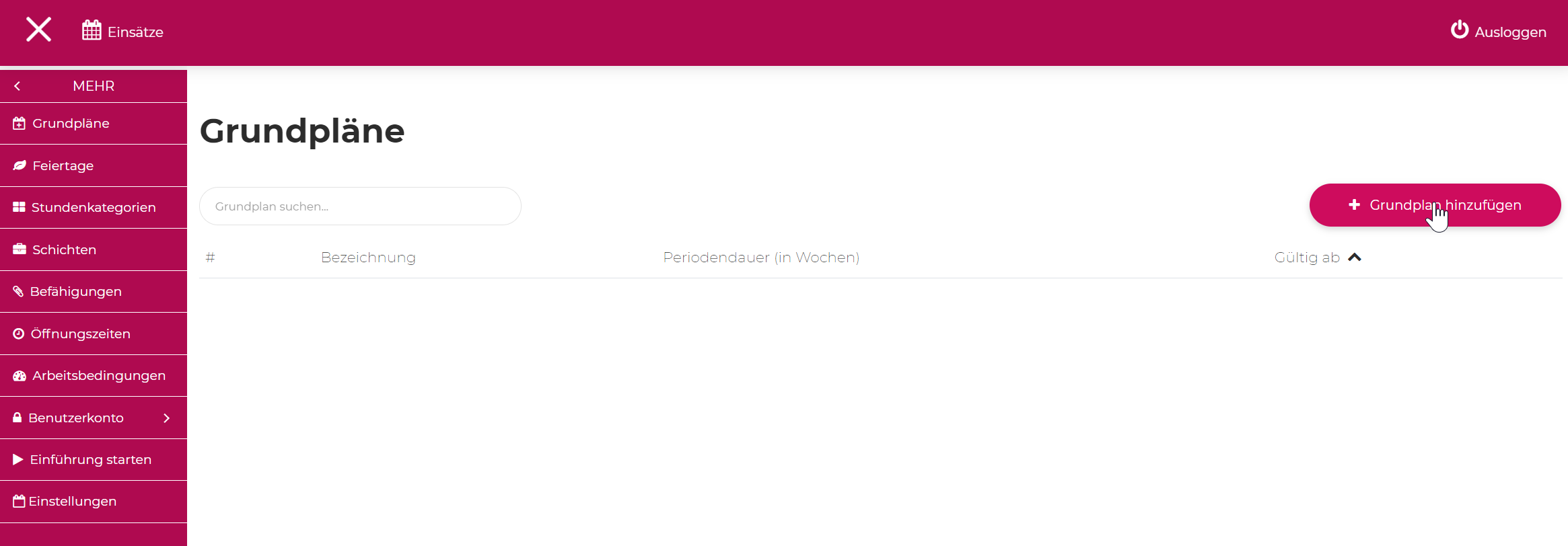 Le plan de base est la base de toute la planification. Dans un premier temps, vous définissez la périodicité selon laquelle l'unité de planification doit se répéter. Vous pouvez créer/ouvrir le plan de base en cliquant sur "Plus" dans la navigation de gauche. Ensuite, ouvrez un plan de base ou créez-en un nouveau.