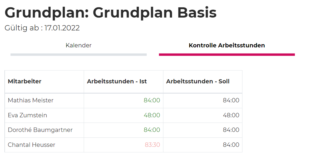Après la création de l'ensemble du plan de base, les temps de travail peuvent être contrôlés une nouvelle fois. Pour ce faire, il suffit de cliquer sur le bouton "Contrôle des temps de travail" au niveau de l'affichage du calendrier.