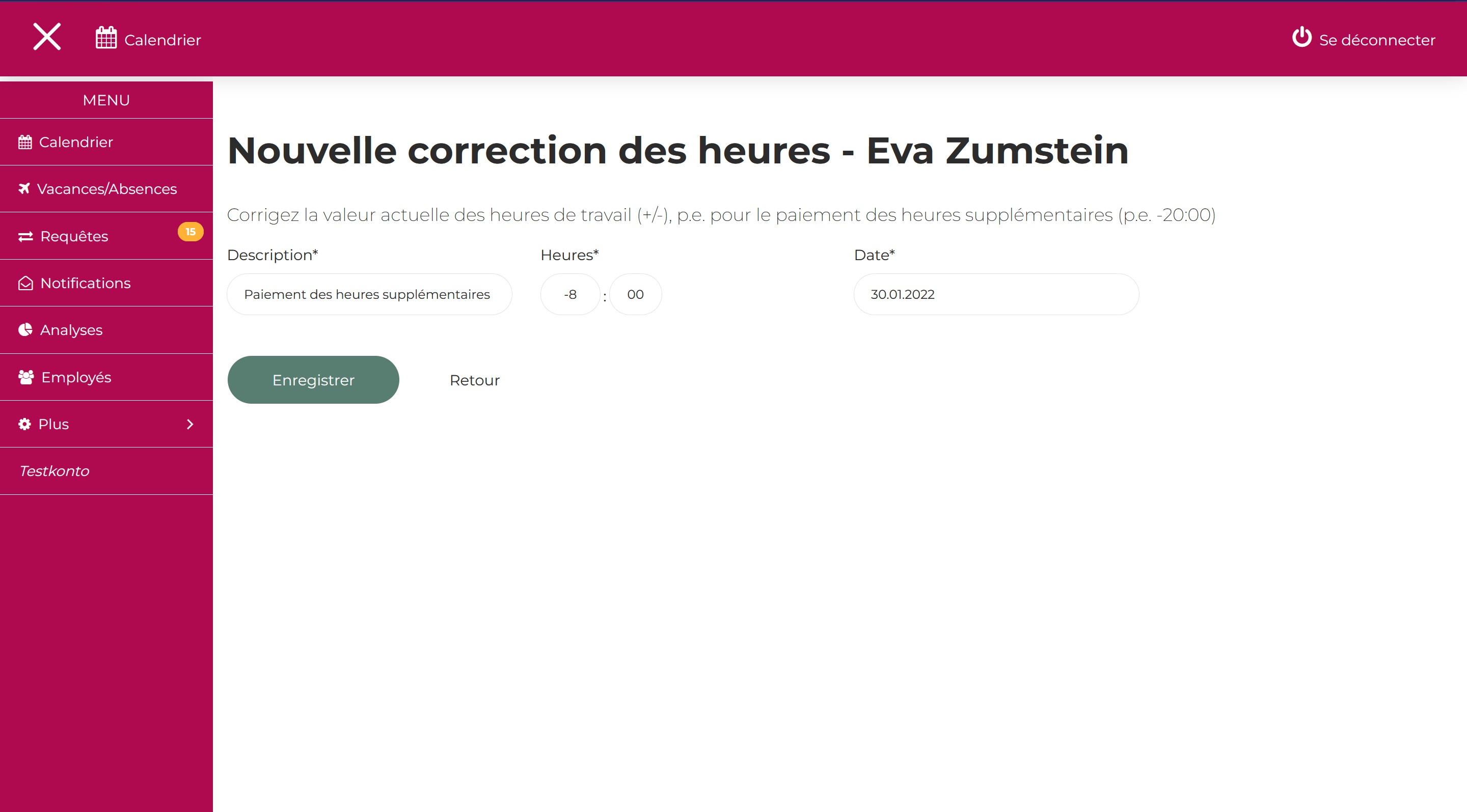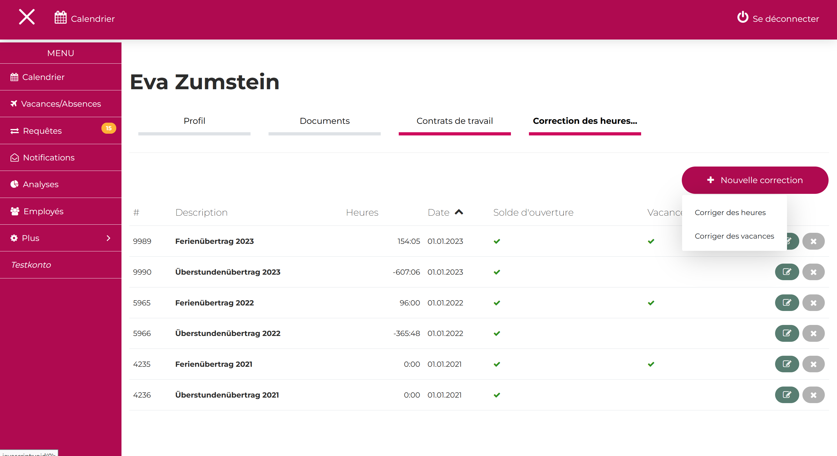 Si des heures sont payées, elles sont précédées d'un signe moins. Si l'on veut offrir des vacances à un collaborateur (p. ex. pour un anniversaire), on va sur "Corriger les vacances" et on saisit un jour de vacances (signe positif).