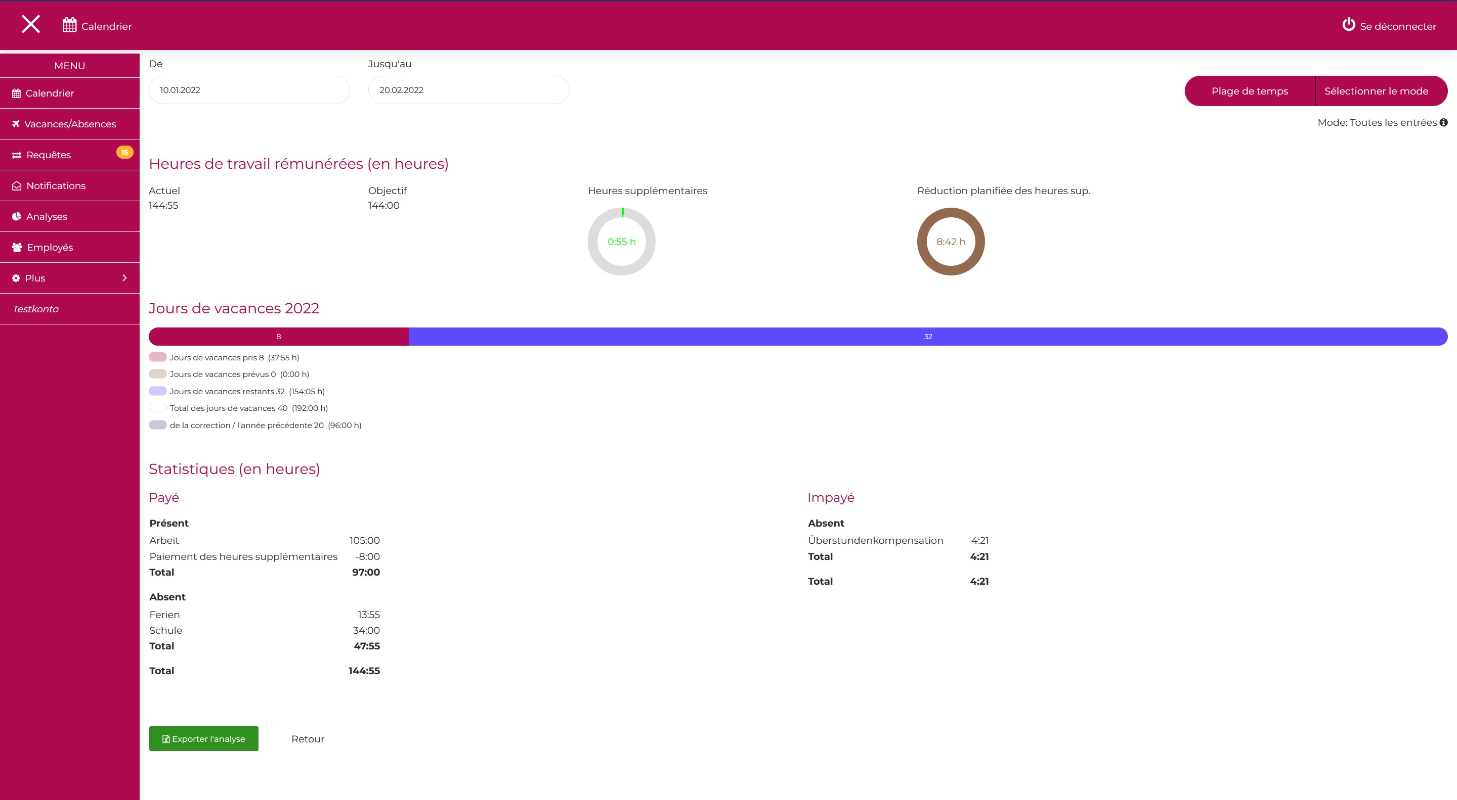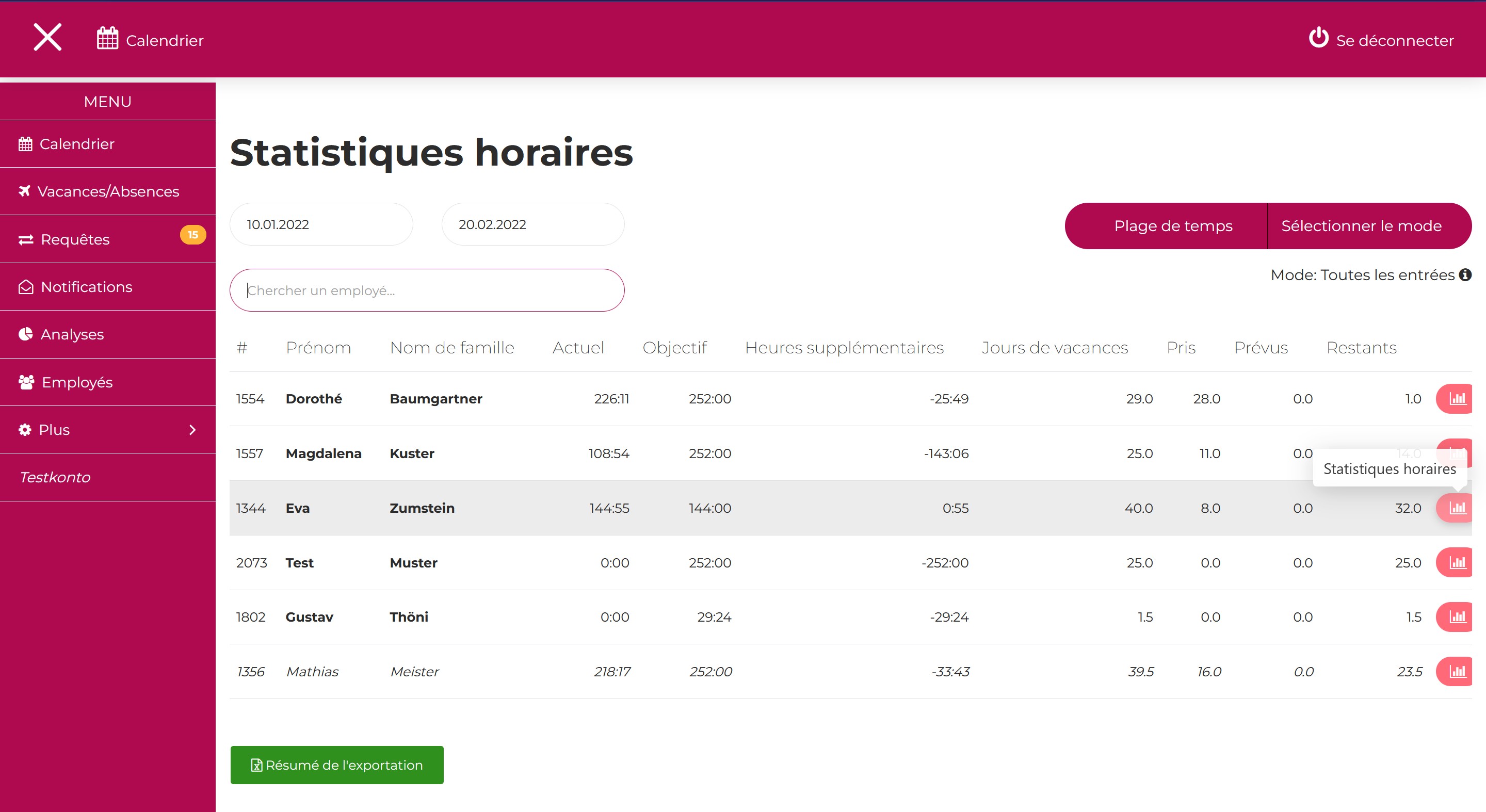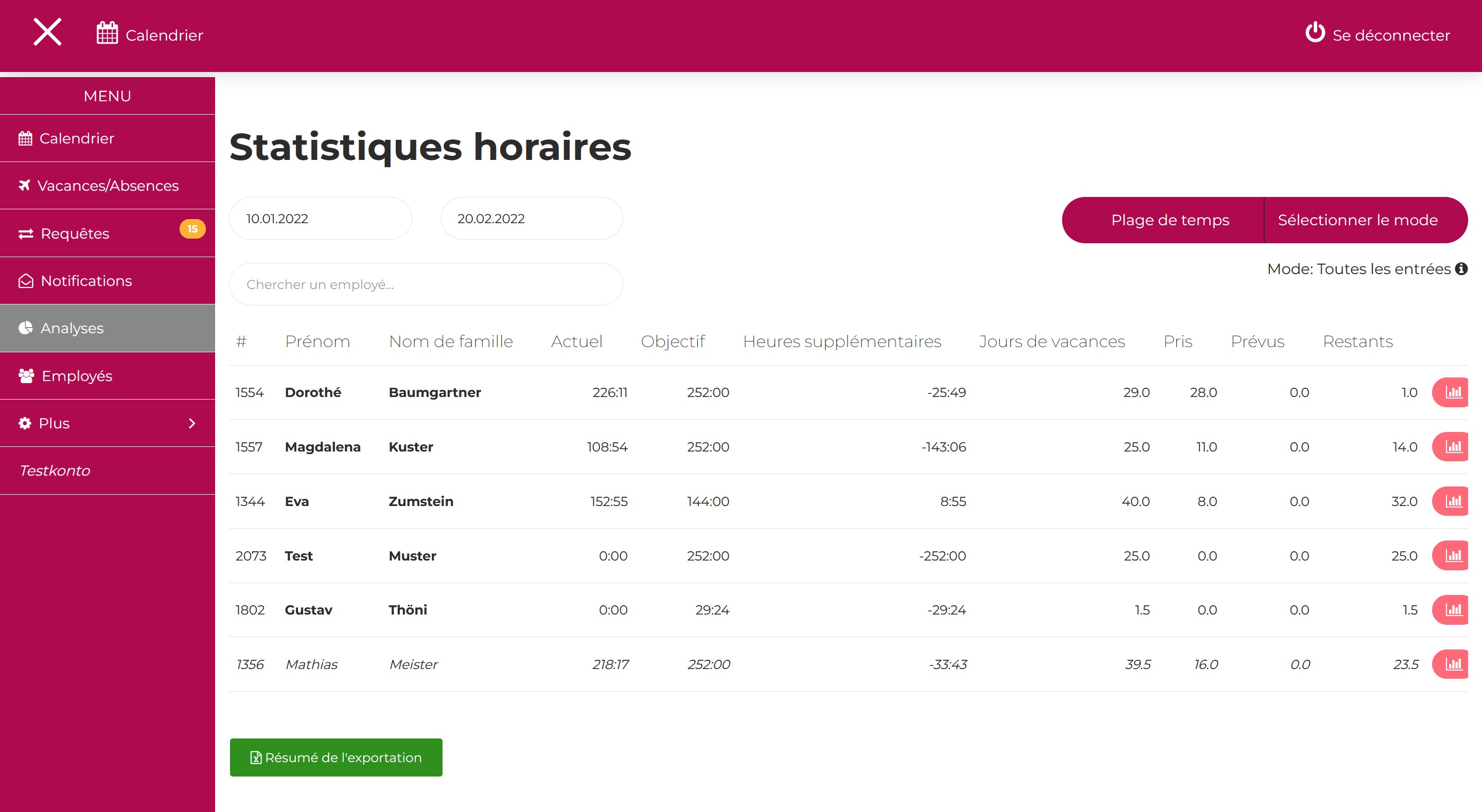 Le nombre d'heures supplémentaires d'un collaborateur est immédiatement visible dans l'aperçu "Analyses".