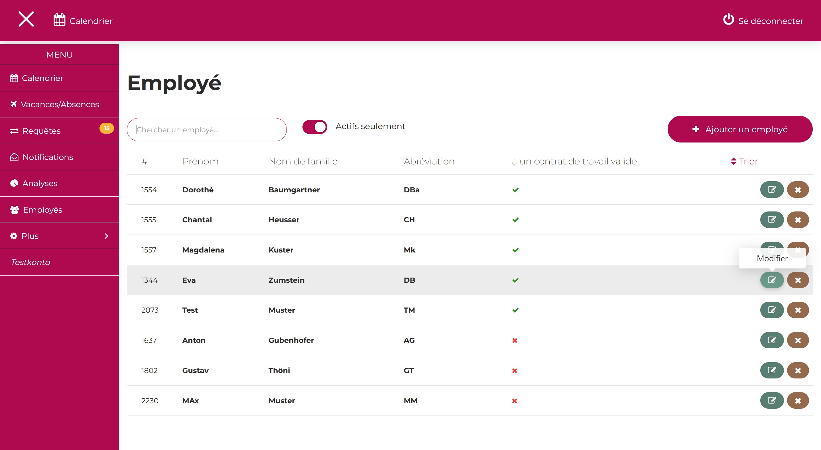 Si ces heures supplémentaires doivent être payées, il faut procéder à une correction des heures. Pour cela, il faut se rendre sur le collaborateur, choisir Modifier et ensuite, dans la navigation supérieure, cliquer sur Plus.