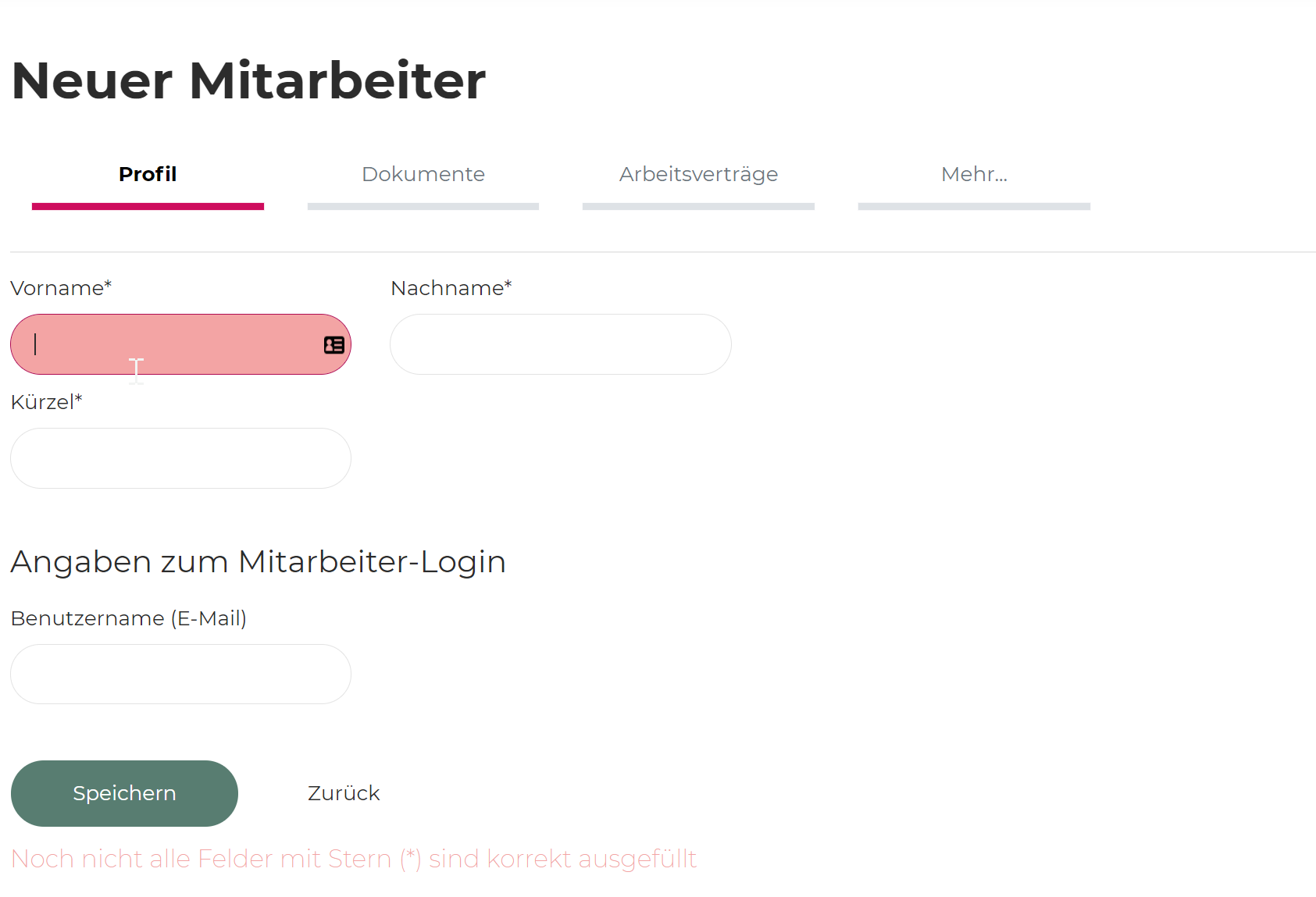 Im Profil erstellen Sie einen neuen Mitarbeitenden. Die Email muss dabei eindeutig sein. Sollte ein Mitarbeitender bereits vorher an einem Ort mit Teamplanner gearbeitet haben, muss beim Austritt die Email verändert werden (kann auch eine virtuelle Email sein), ansonsten kann diese nicht wieder verwendet werden.