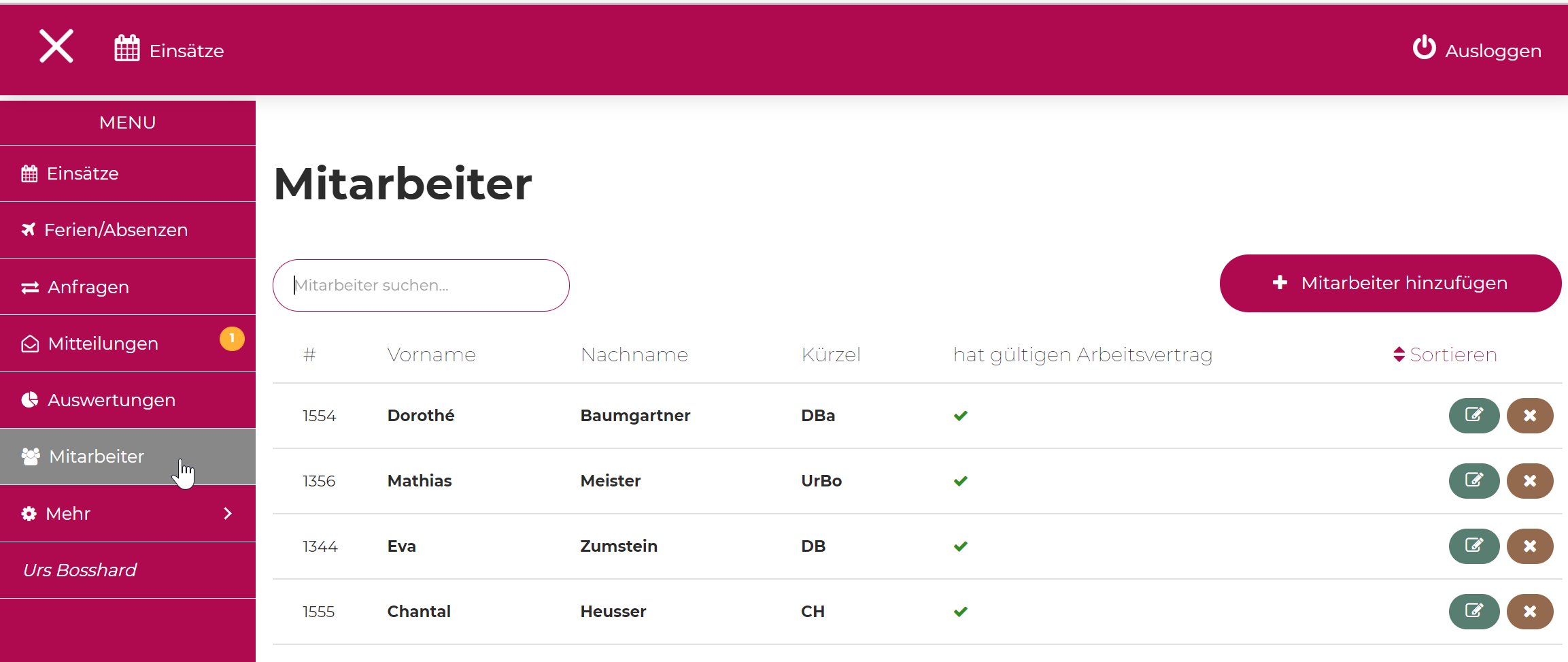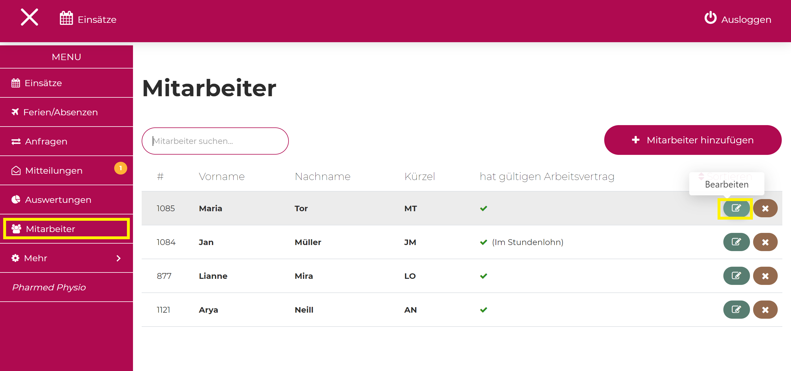 Klicken Sie auf die Schaltfläche 'Mitarbeiter' im Menü. Es eröffnet sich Ihnen der Mitarbeiterüberblick. Klicken Sie nun auf das Stiftsymbol bei demjenigen Mitarbeiter, den Sie bearbeiten möchten.