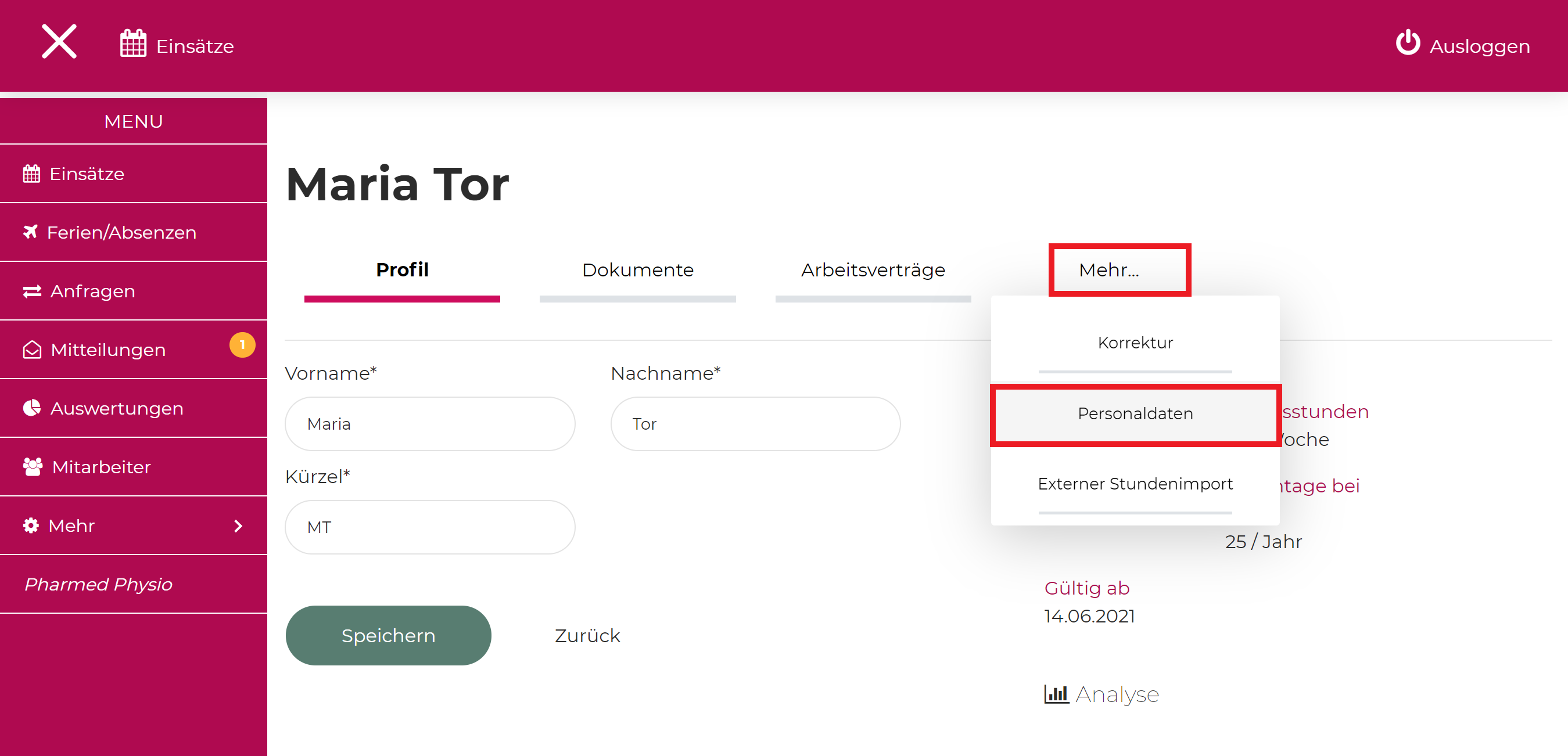 Anschliessend wählen Sie die Rubrik 'Mehr' an und klicken im Drop-Down-Menü die Option 'Personaldaten'.
