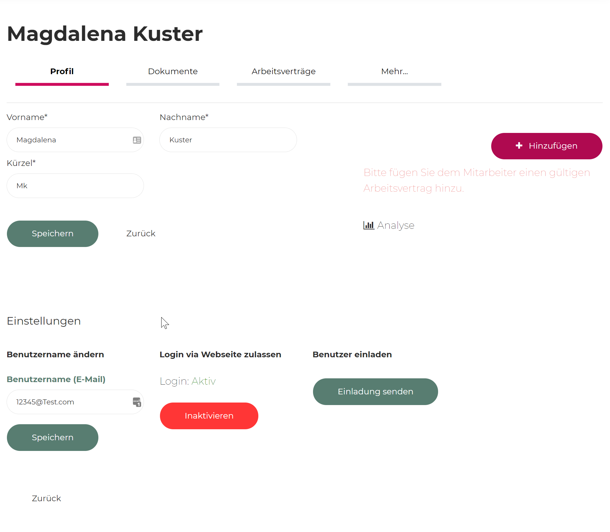 Sobald der neue Mitarbeitende erstellt ist, kann diesem ein Einladungslink verschickt werden. Wichtig ist, dass nun noch ein Arbeitsvertrag hinterlegt wird.