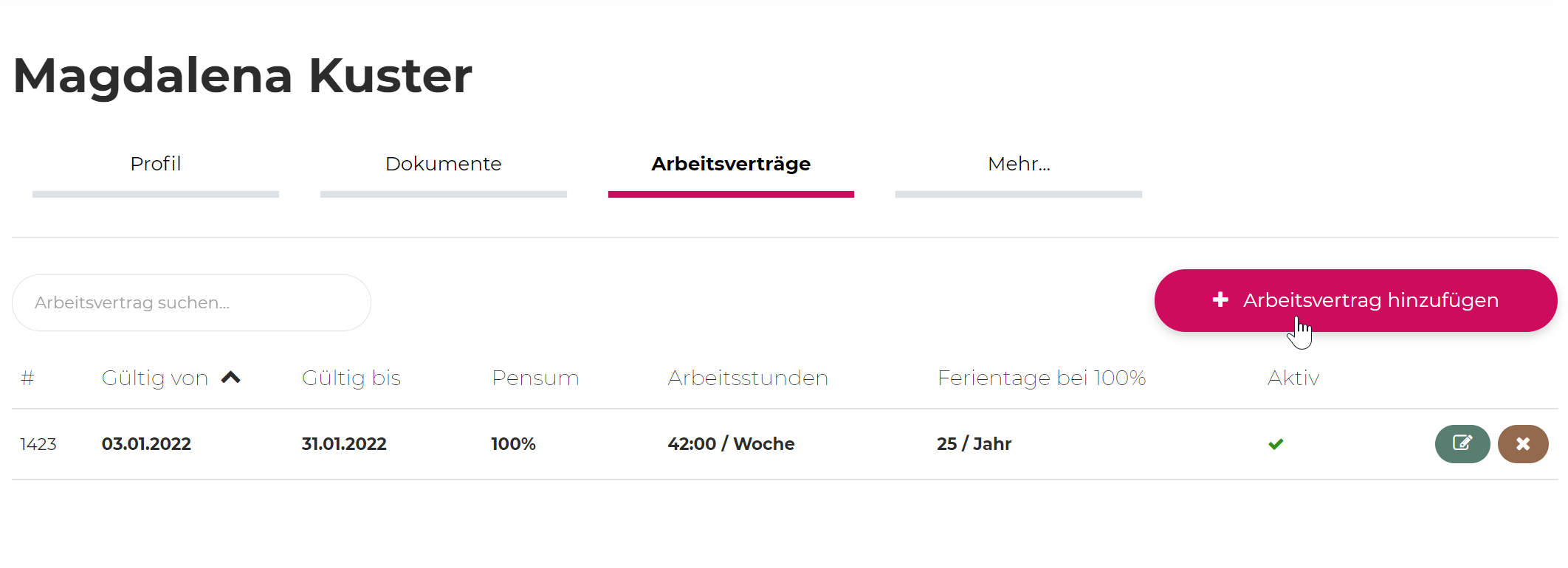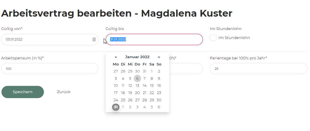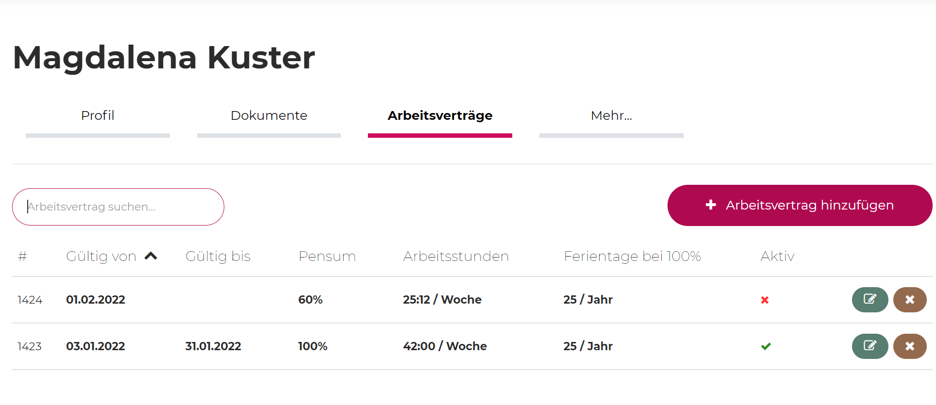 Ein Wechsel des Pensums ist sehr einfach. Dazu wird der bestehende Arbeitsvertrag beendet (unter Bearbeiten).