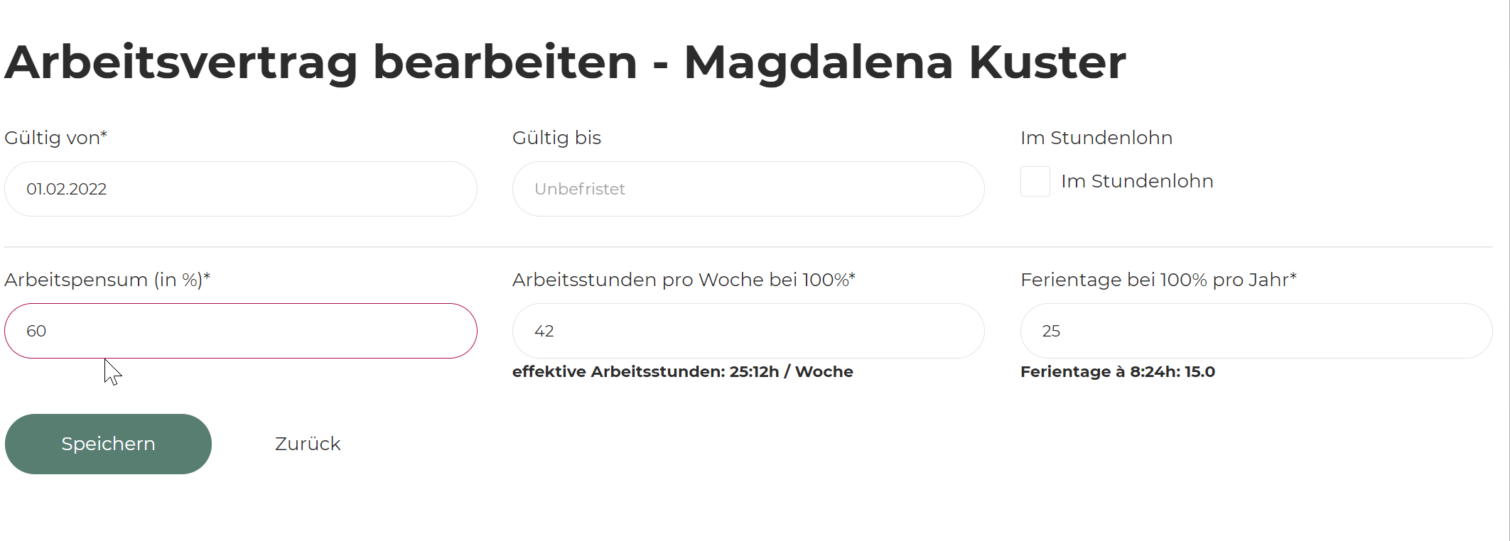 Danach wird ein neuer Vertrag erstellt und der Teamplanner berechnet alle Daten tagesgenau (Anteil Ferien bie Ende Jahr) oder übernimmt bestehende Saldi minutengenau (Ferien, Ist-Stunden)