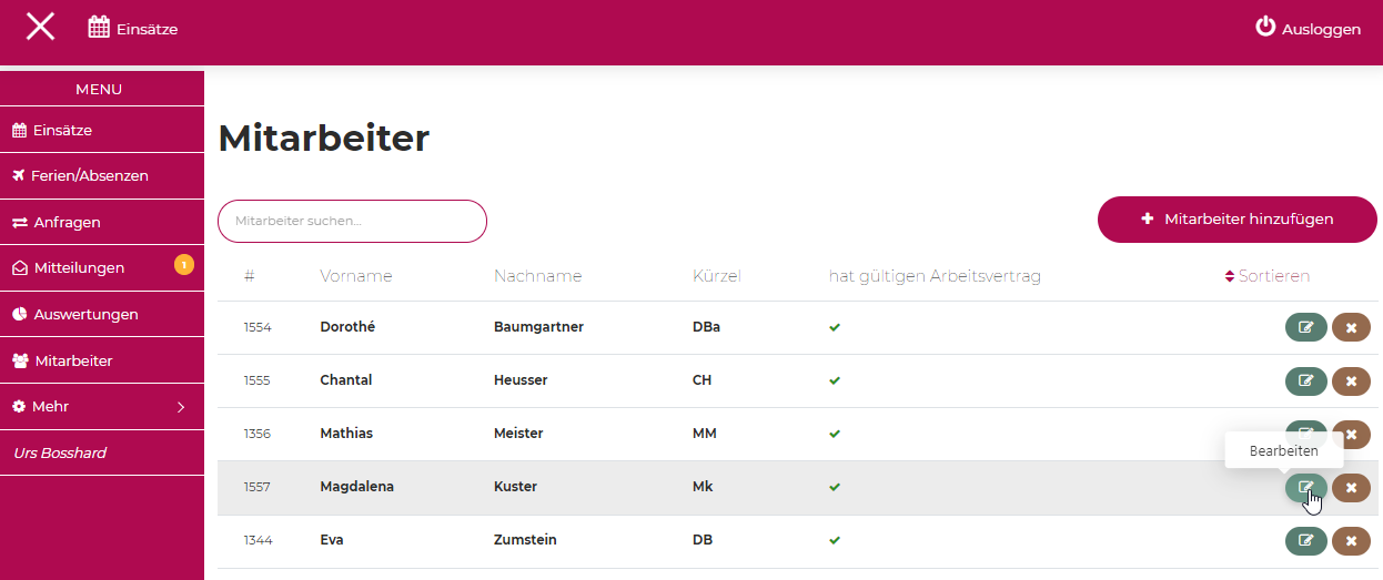 DIe Personaldaten werden unter dem Mitarbeitenden erfasst. Dazu wählen Sie auf der linken Navigation "Mitarbeiter" und gehen beim ensprechenden Mitarbeitenden auf Bearbeiten.